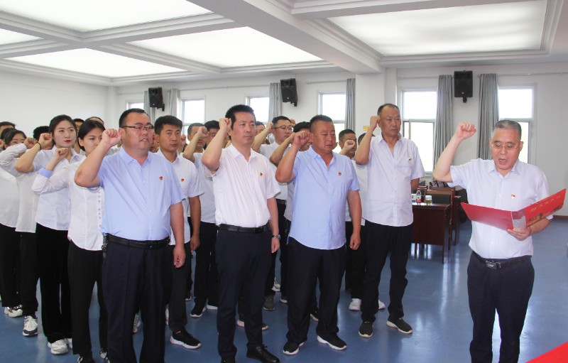 6月30日上午,慶?;顒釉诩ぐ旱膰杪曋欣_了序幕,全體參會人員肅立,以飽滿的精神狀態(tài)齊唱國歌?!拔抑驹讣尤胫袊伯a(chǎn)黨,擁護黨的綱領(lǐng),遵守黨的章程,履行黨員義務(wù)......”全體黨員列隊,面對鮮艷的黨旗,由新能源公司黨支部書記、董事長馬有勝同志領(lǐng)誓,重溫入黨誓詞。錚錚誓言代表了每一位黨員忠誠奉獻、嚴(yán)于律己。