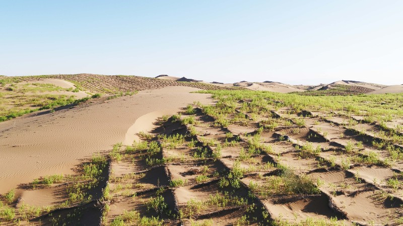 項目設(shè)置不同材料的沙障,栽植多種沙生植物,并建立沙漠治理效果監(jiān)測體系,研究不同沙障材料的耐久性,不同沙生植物的保存率,以及其在防沙治沙領(lǐng)域的防護(hù)效果及經(jīng)濟(jì)性,評估后期有無次生危害。通過對不同類型沙障和沙生植物防沙治沙效能評價,篩選出適宜本地區(qū)效果良好的沙障和沙生植物?;趯Y選出的沙障進(jìn)行機(jī)械化布設(shè),研發(fā)設(shè)計先進(jìn)的適用于沙漠環(huán)境的固沙裝備,形成標(biāo)準(zhǔn)化生產(chǎn)車間及生產(chǎn)線。利用研制出的固沙裝備布設(shè)篩選出的沙障,栽植篩選出的沙生植物,研究出一種全新的防沙治沙技術(shù),建立一套完整的防沙治沙新模式,進(jìn)行試驗示范并推廣應(yīng)用。