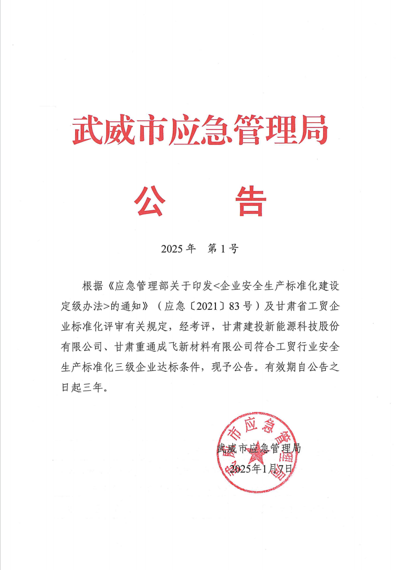 甘肅建投新能源公司再獲“安全生產(chǎn)標(biāo)準(zhǔn)化三級(jí)企業(yè)”