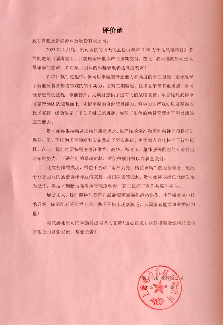 項目自啟動以來,新能源公司充分發(fā)揮其在風電建設(shè)領(lǐng)域的技術(shù)和管理優(yōu)勢。以高效的組織協(xié)調(diào)能力、嚴謹?shù)氖┕す芾硭胶蛣?wù)實的合作精神,贏得了上海電建公司的高度認可。上海電力機械有限公司在評價函中特別提到,“甘肅建投新能源公司始終乘持精益求精的質(zhì)量理念,以嚴謹?shù)臉藴屎推跫s精神為項目推進保駕護航,不僅為項目的順利實施奠定了堅實基礎(chǔ),更為雙方合作樹立了行業(yè)標桿?!?/span>