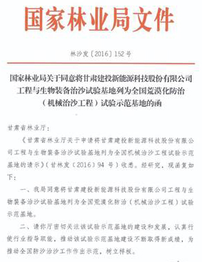 全國荒漠化防治(機(jī)械治沙工程)試驗(yàn)示范基地以科學(xué)發(fā)展觀為指導(dǎo),生態(tài)科學(xué)性為原則,以生態(tài)保護(hù)、生態(tài)鞏固、生態(tài)恢復(fù)、生態(tài)建設(shè)為核心,利用新能源技術(shù)、節(jié)水技術(shù)、生物技術(shù)、農(nóng)業(yè)技術(shù)、機(jī)械技術(shù),通過治沙造林、封沙育林(草)、造林綠化等,使沙漠化得以遏制、生物多樣性進(jìn)一步豐富,最終實(shí)現(xiàn)生態(tài)環(huán)境狀況步入良性循環(huán)軌道,并促進(jìn)經(jīng)濟(jì)社會可持續(xù)發(fā)展,獲得生態(tài)效益與經(jīng)濟(jì)效益的雙贏。(2016年10月甘肅建投新能源科技股份有限公司工程與生物裝備治沙試驗(yàn)基地被國家林業(yè)局列為全國荒漠化防治(機(jī)械治沙工程)試驗(yàn)示范基地)