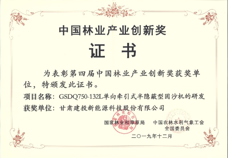 (通訊員:李小東)近日,國(guó)家林業(yè)和草原局、中國(guó)農(nóng)林水利氣象工會(huì)全國(guó)委員會(huì)公布第四屆“中國(guó)林業(yè)產(chǎn)業(yè)突出貢獻(xiàn)獎(jiǎng)、創(chuàng)新獎(jiǎng)”獲獎(jiǎng)名單,由甘肅建投新能源科技股份有限公司申報(bào)的“GSDQ750-132L單項(xiàng)牽引式半隱蔽型固沙機(jī)的研發(fā)”項(xiàng)目喜獲第四屆“中國(guó)林業(yè)產(chǎn)業(yè)創(chuàng)新獎(jiǎng)”。此外,從國(guó)家林業(yè)和草原局公布的第四批國(guó)家林業(yè)重點(diǎn)龍頭企業(yè)認(rèn)定名單中獲悉,新能源公司榜上有名。