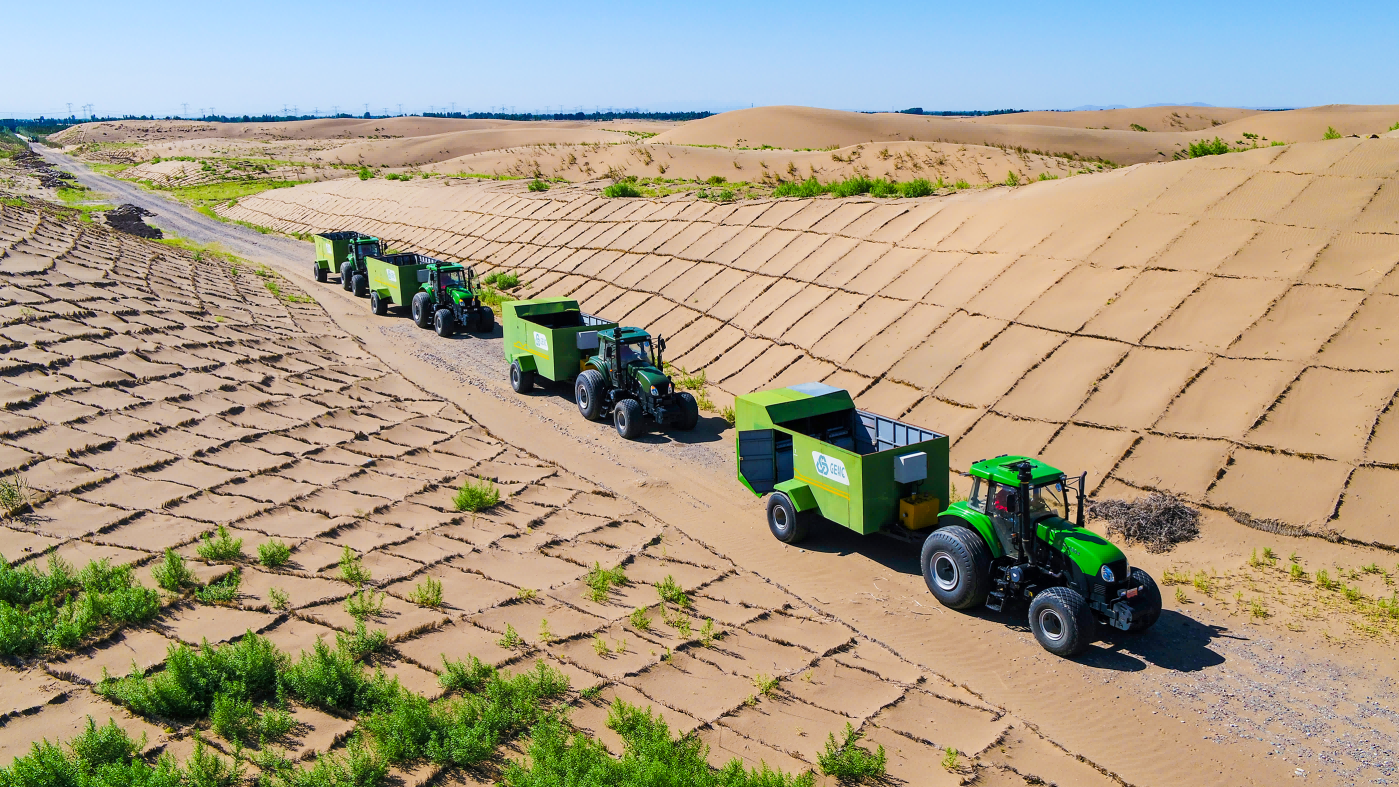 在浩瀚無垠的騰格里沙漠,新能源公司自主研制的治沙車,成為改變生態(tài)命運的“綠色先鋒”。LGSV-200多功能立體固沙機、GSDQ750-132L單向牽引式半隱蔽型草沙障固沙機等一系列國際領(lǐng)先機械治沙裝備,在沙漠中縱橫馳騁,高效完成草方格鋪設(shè)、植被種植等艱巨任務(wù)。它們配備的智能控制系統(tǒng),可依據(jù)不同的沙漠地形與土壤條件,精準(zhǔn)調(diào)整工作模式,工作效率遠(yuǎn)超人工操作數(shù)倍。伴隨著治沙車的穿梭,原本肆虐的黃沙逐漸被綠色植被覆蓋,沙漠生態(tài)環(huán)境得到有效改善。新能源公司積極探索沙漠治理新模式,不斷拓展生態(tài)領(lǐng)域的多元化業(yè)務(wù),在騰格里沙漠南緣開展工程與生物治沙試驗示范與推廣,成功建立了全國荒漠化防治(機械治沙工程)試驗示范基地,承攬的千里沙漠大林帶機械固沙項目等一系列機械化防沙治沙工程,已累計完成一萬余畝沙漠綜合治理。2024年,公司高性能治沙機械產(chǎn)品GSDQ750-132L單向牽引式半隱蔽型草沙障固沙機入選《“三北”工程首批適用林草機械裝備》目錄。
