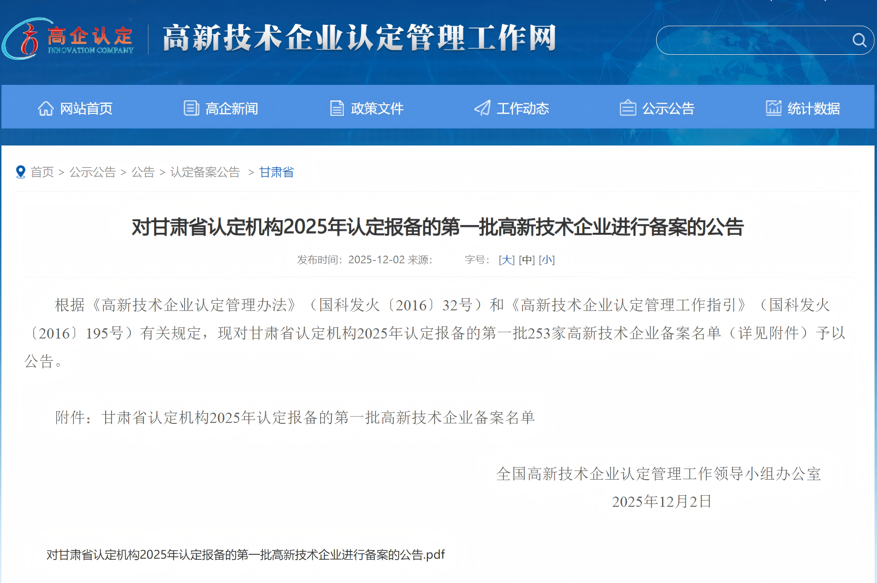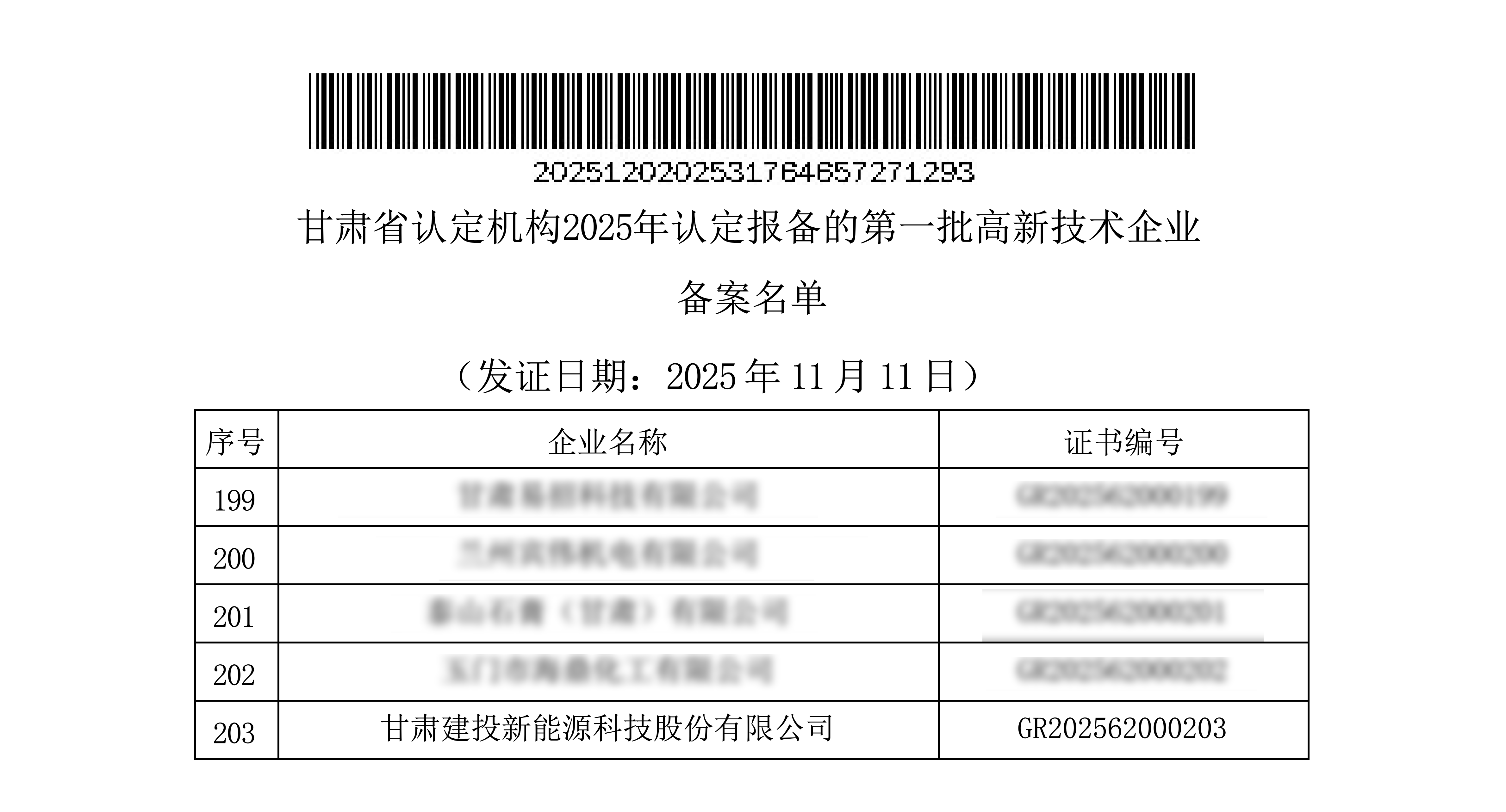 12月2日,全國(guó)高新技術(shù)企業(yè)認(rèn)定管理工作領(lǐng)導(dǎo)小組辦公室公布《甘肅省認(rèn)定機(jī)構(gòu)2025年認(rèn)定報(bào)備的第一批253家高新技術(shù)企業(yè)備案名單》,甘肅建投新能源公司順利通過2025年度高新技術(shù)企業(yè)復(fù)審,第三次榮獲“國(guó)家高新技術(shù)企業(yè)”榮譽(yù)稱號(hào)!