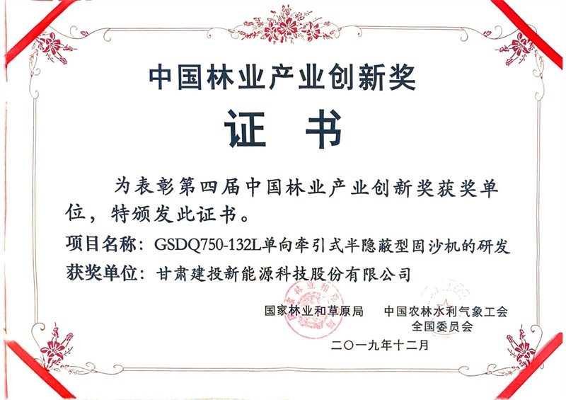 中國林業(yè)產(chǎn)業(yè)創(chuàng)新獎(jiǎng)-GSDQ750-132L單向牽引式半隱蔽型固沙機(jī)的研發(fā)項(xiàng)目