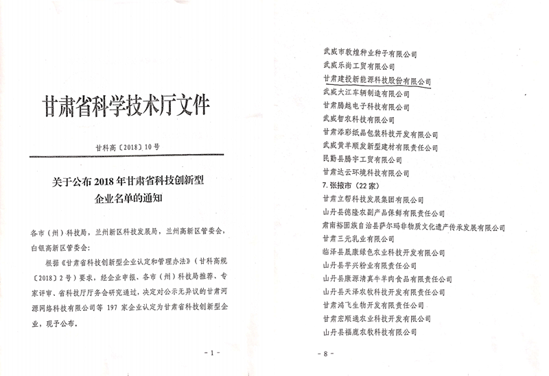 關于公布2018年甘肅省科技創(chuàng)新型企業(yè)名單的通知