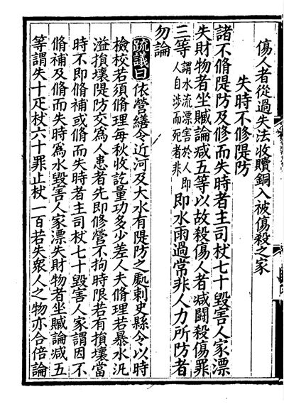 清嘉慶年間版《唐律疏議》書影,這一頁展示的是對“失時不修堤防”的懲處措施。