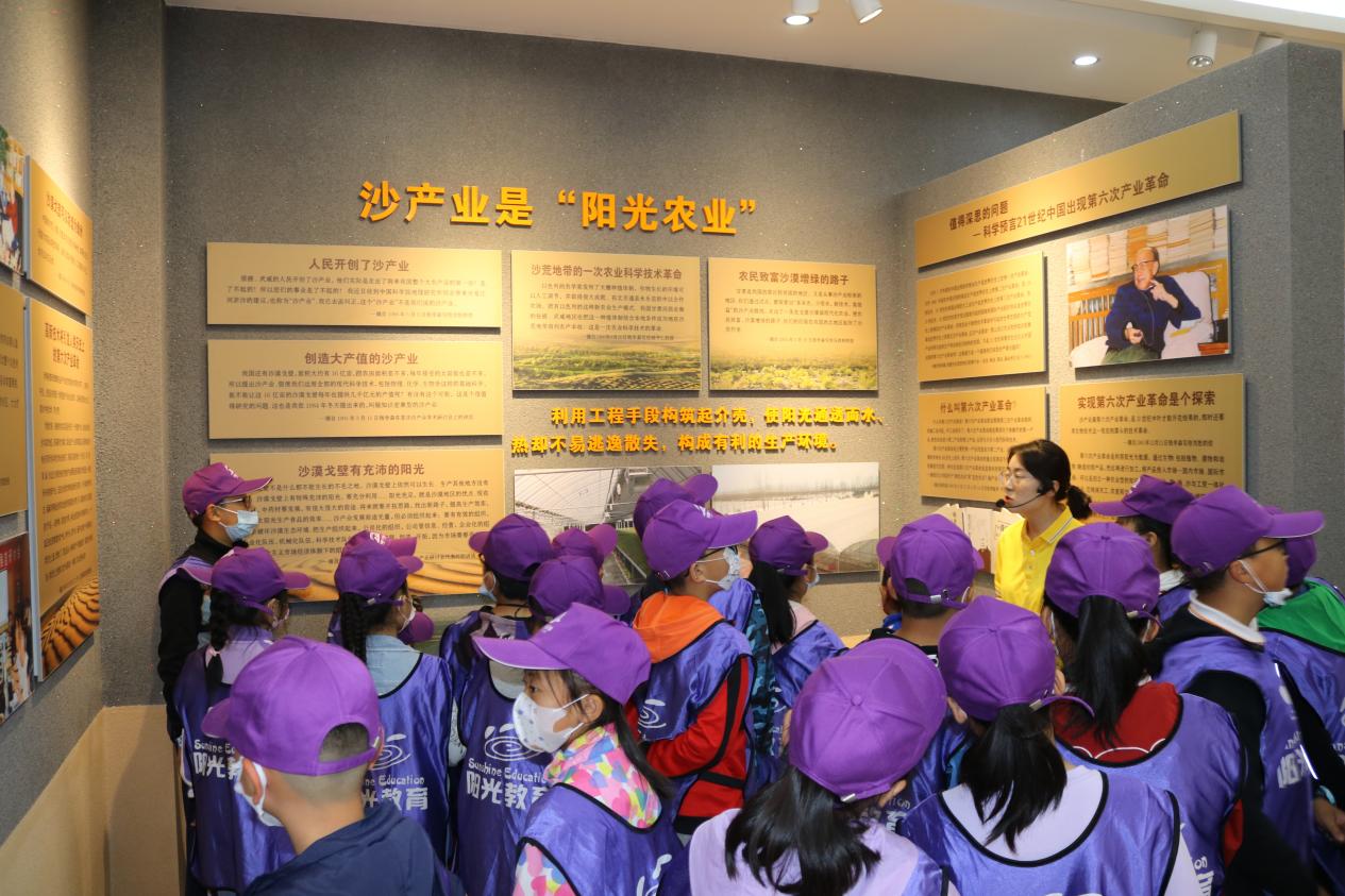 在沙產(chǎn)業(yè)展廳,孩子們駐足聆聽錢學(xué)森和宋平關(guān)于沙產(chǎn)業(yè)的概念以及發(fā)展歷程以及他們?yōu)榉郎持紊乘龅呢暙I(xiàn)和努力。